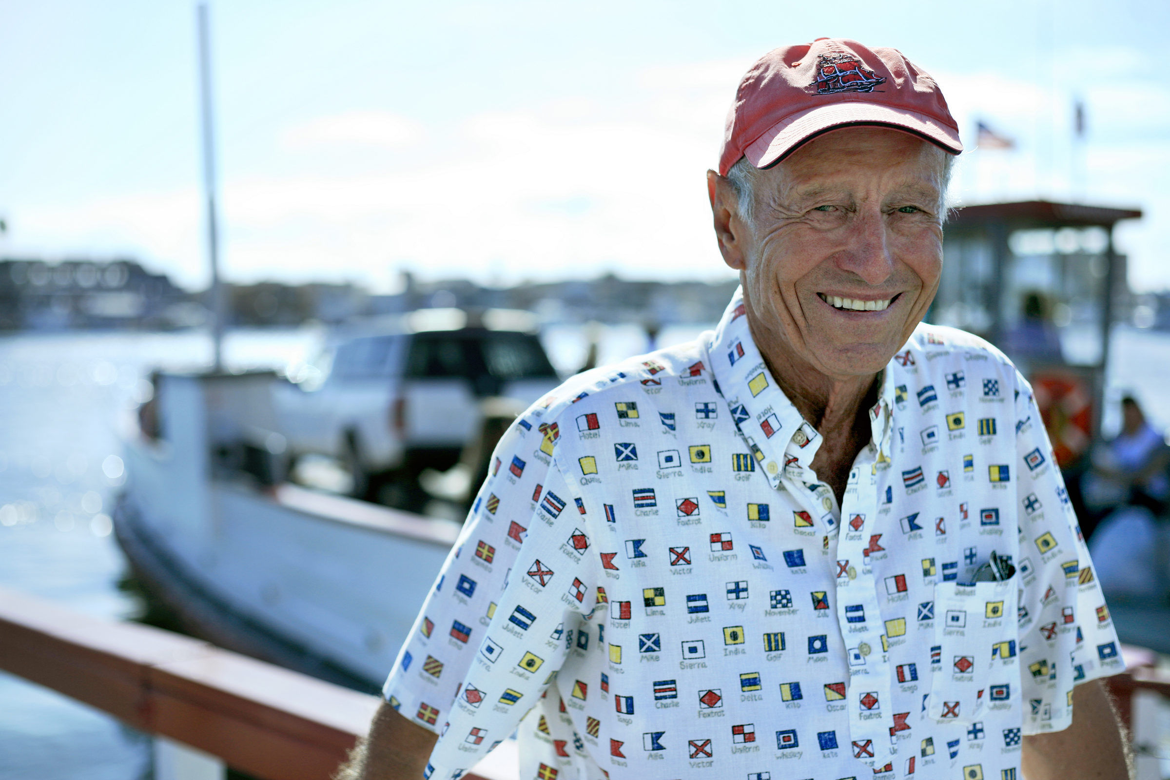 Balboa Island Ferry owner/operator Seymour Beek on the dock next to the island landing for the ferry (seen in the background headed to the Balboa Peninsula). NB Indy file photo.