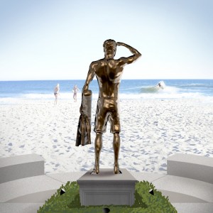 Plans call for the sculpture to be manufactured out of either stainless steel or bronze in a silver or gold matte finish. The sculpture would be 9 feet tall, and is a strong and definitive form of Carlson as a lifeguard searching the ocean as he did for 15 years.