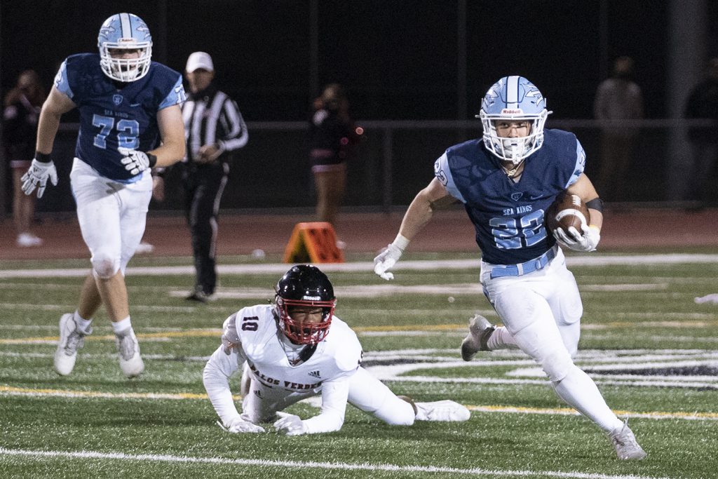 Newport Harbor wide receiver Kashton Henjum (#6) takes the ball across midfield.Newport Harbor outside linebacker Leo Davis (#30) is determined to tackle a Yorba Linda playerCorona del Mar corner back Dallas Roberts (#22) avoids a tackle.Corona del Mar running back James Cotton (#25) is brought down by a Palos Verdes player