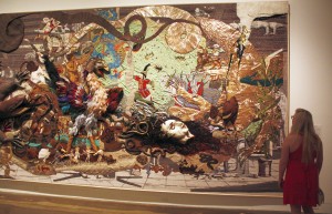 “Each room had a different feel and theme while still being cohesive by articulating a specific generation of Chinese artists,” noted Catherine. “One of my favorite pieces was ‘Fearless’ by Xu Zhen. This large canvas takes up a good part of a wall, and is filled with mixed media that represents political cartoons, large serpents and feathered beasts, which challenges the viewer’s perception of what it commonly, and traditionally, seen as “Chinese art.”