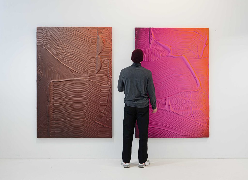 Benjamin’s wall-based works are built through layered pigments, compressed air, and industrial materials that form dense, tactile surfaces. Light is not depicted but emerges through the interaction of color, texture, and physical depth, changing subtly with the viewer’s perspective.