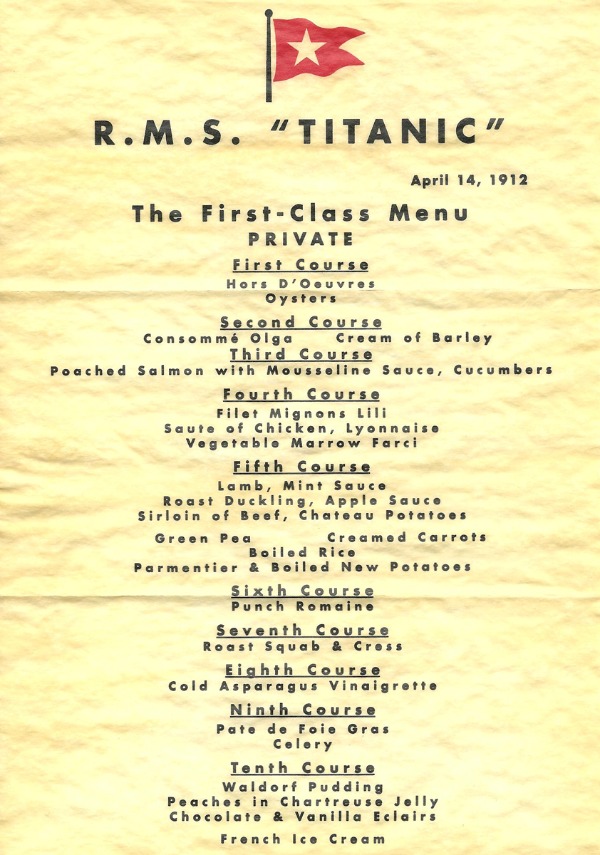 I recently came across a replica of the final First Class menu served a few hours before the Titanic sank. The 10-course menu is a fascinating glimpse into the palate pleasing dishes prepared for upscale passengers.
