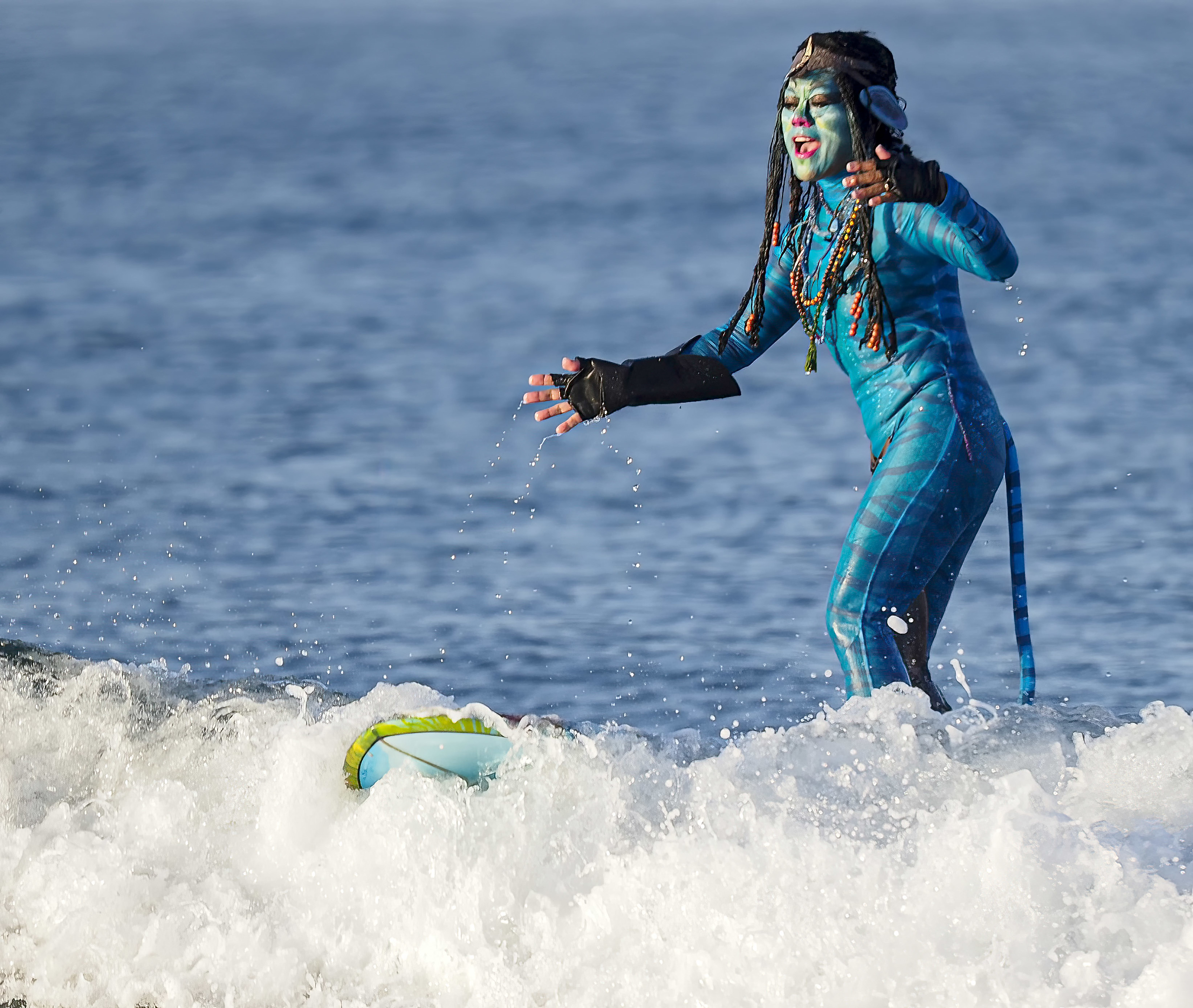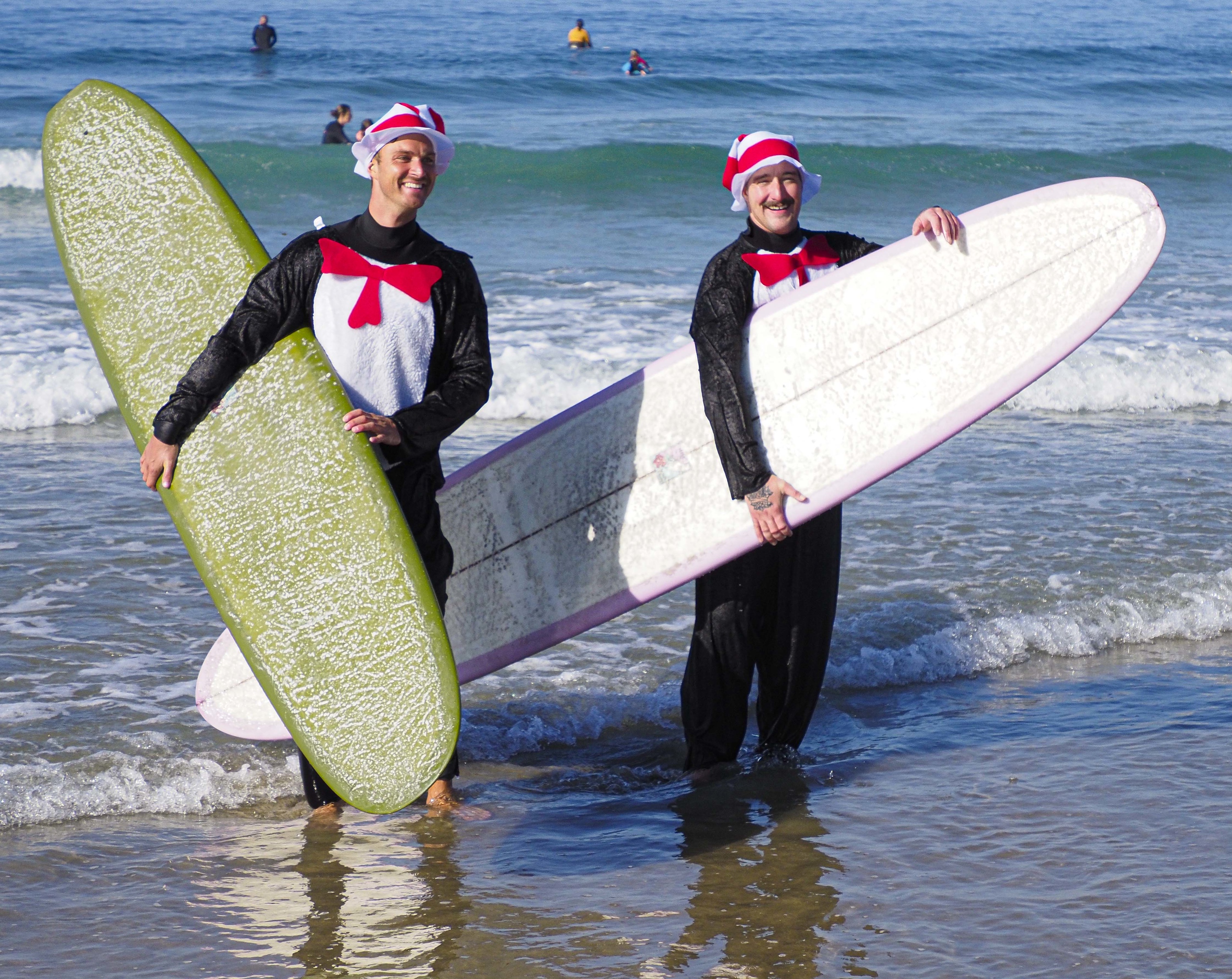 More than 100 people showed up to surf the waves dressed as Super Mario brothers, Smurfs, pirates and other getups.