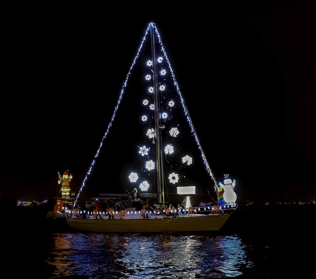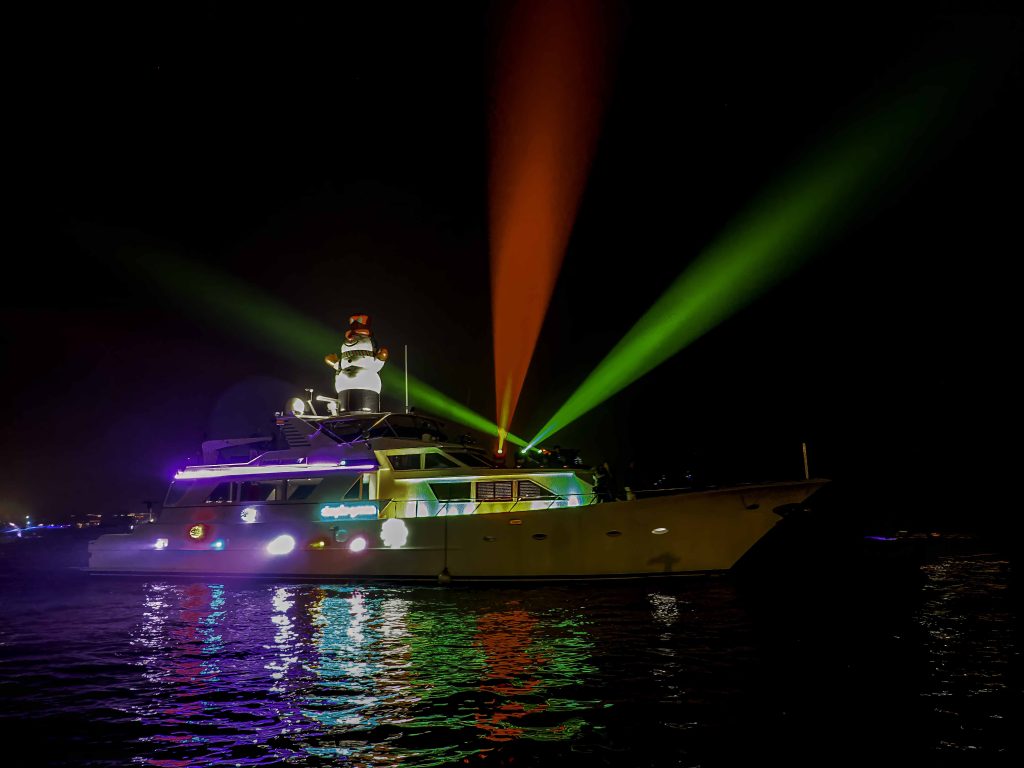 As the parade moved toward Marina Park, dozens of vessels — ranging from multi-million-dollar yachts to small kayaks — showcased decorations and holiday spirit. This year’s theme encouraged participants to recreate holiday memories from various eras, resulting in floating tributes to 1950s diners and 1980s neon wonderlands.