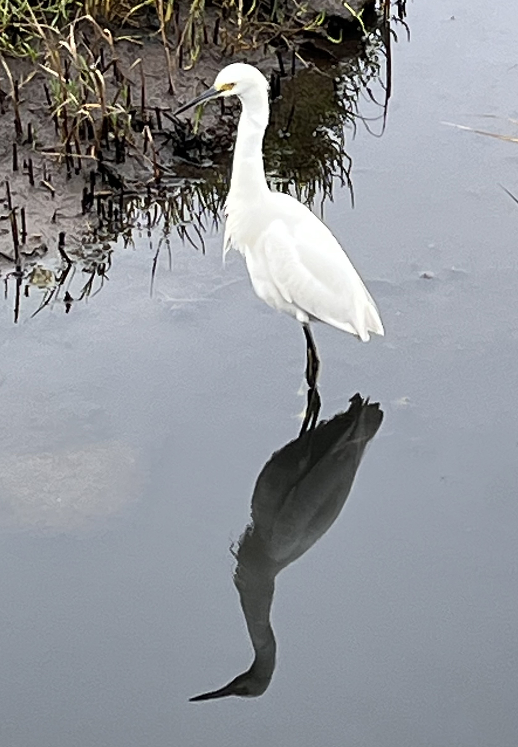 The accompanying egret photo was made possible not by a Nikon with a telephoto lens, but via both a slow foot approach to the edge of the paved road along with my constant companion, the iPhone. Had the hungry egret not been hypnotized by the promise of tiny fish darting about, it doubtlessly would’ve flapped a speedy escape to other waterholes.