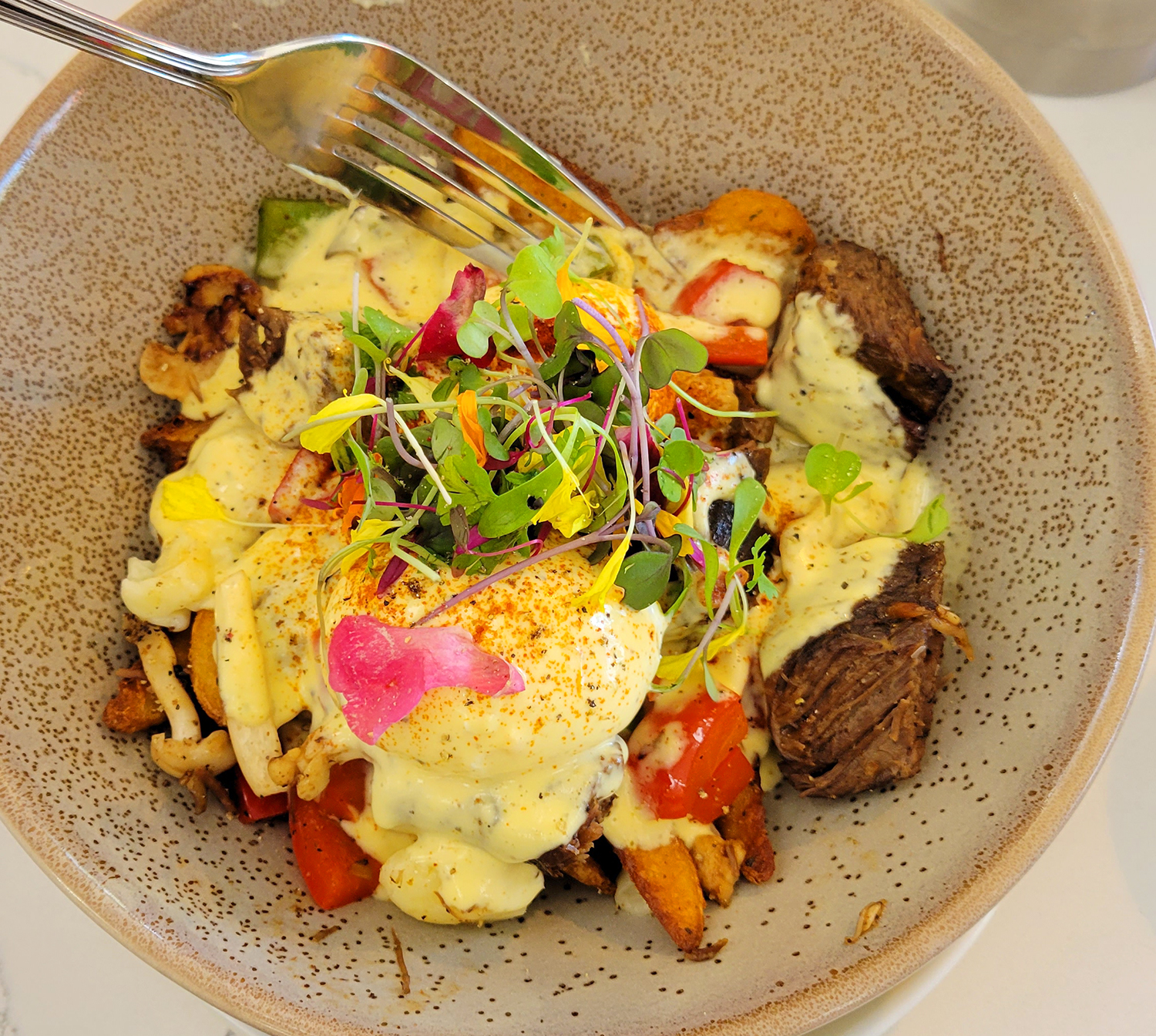 Richard has a gluten-free diet and found several dishes he could have. I love poutine, so I went with the Get Shorty breakfast bowl: poached eggs, duck fat fried herb potatoes, fresh cheese curds, beef short rib, bell peppers, mushrooms, and brown butter hollandaise An excellent choice—a hearty, tasty dish.