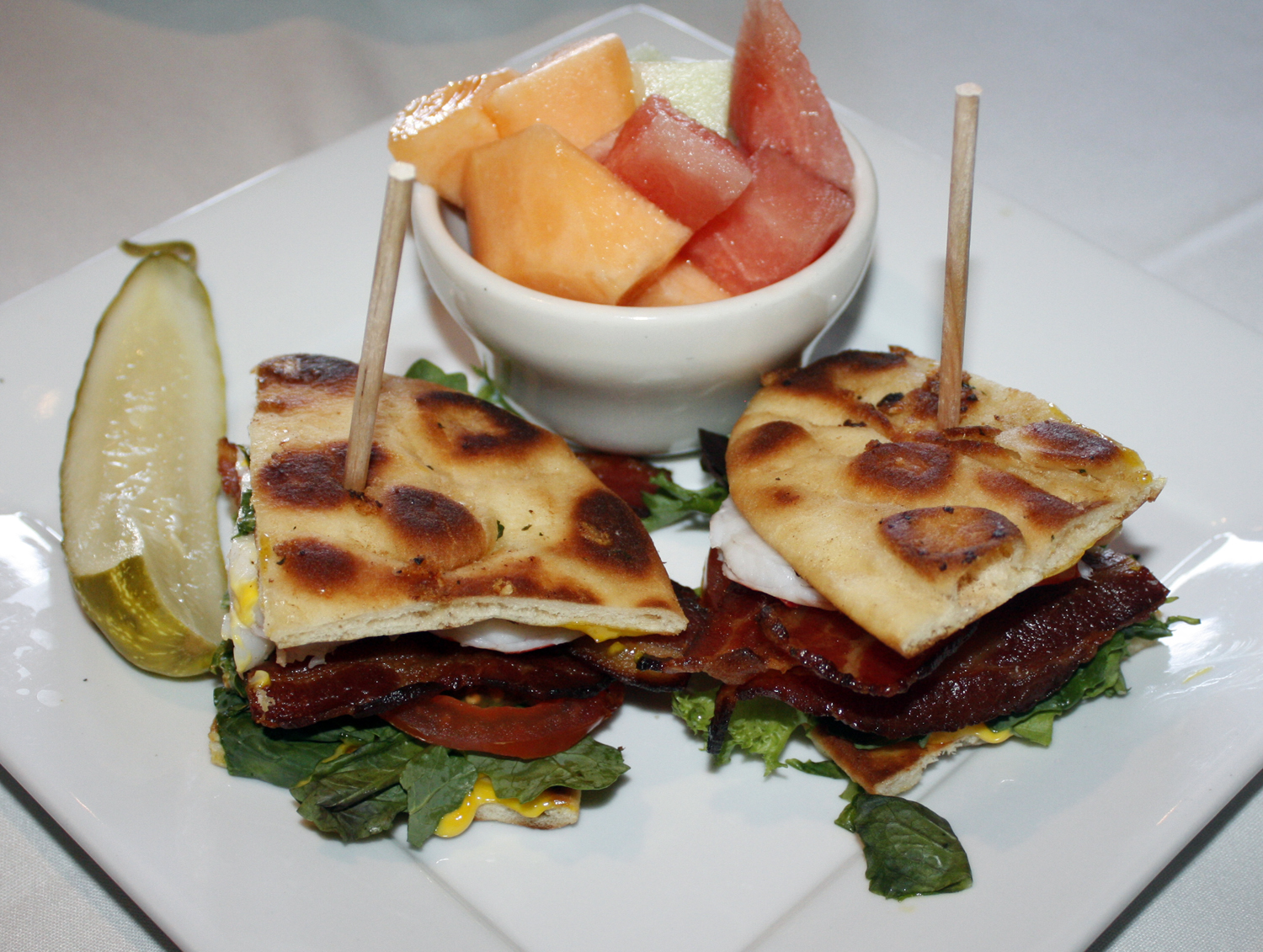Next, he ordered that Shrimp BLT Sandwich, which has jumbo prawns and Applewood smoked bacon with lettuce, tomatoes, saffron aioli, and naan bread.