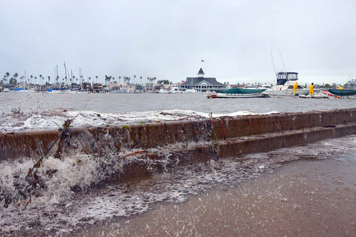 Water breaching the Balboa Island seawalls in December 2010.