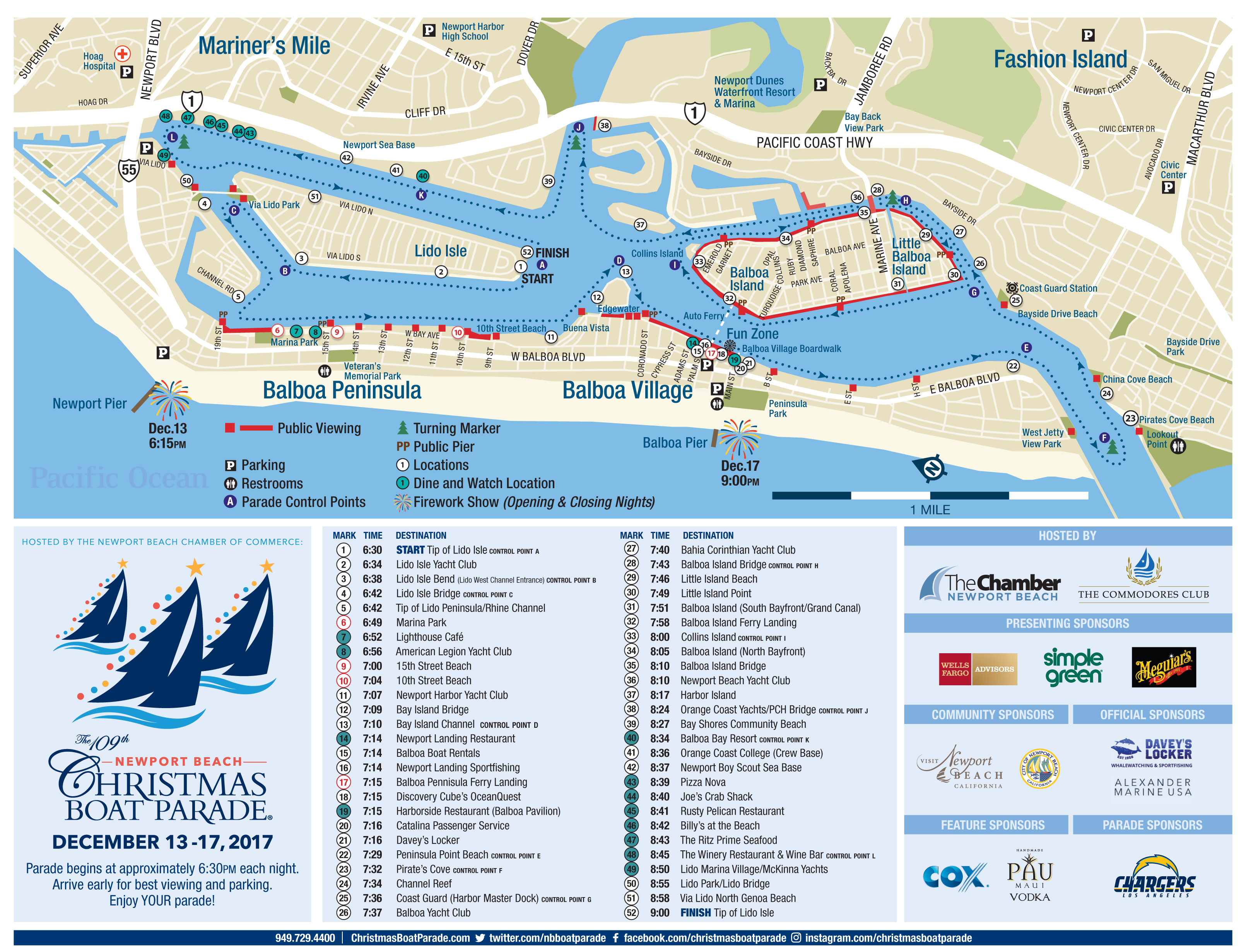 This year, the parade has a new starting and ending point at the tip of Lido Island. The parade will begin at approximately 6:30 p.m. each night from the east end of Lido Island following the parade’s regular route, with the first public viewing destination now at Marina Park on Balboa Peninsula.