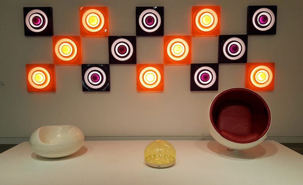 Among other recognizable pieces in this notable exhibition: the “Marshmallow” chair by George Nelson Associates, Inc., lounge chairs by Charles and Ray Eames, Warhol’s “Mao,” and even 1960s record album covers (including “Sgt. Pepper’s Lonely Hearts Club Band” and “The Velvet Underground”).
