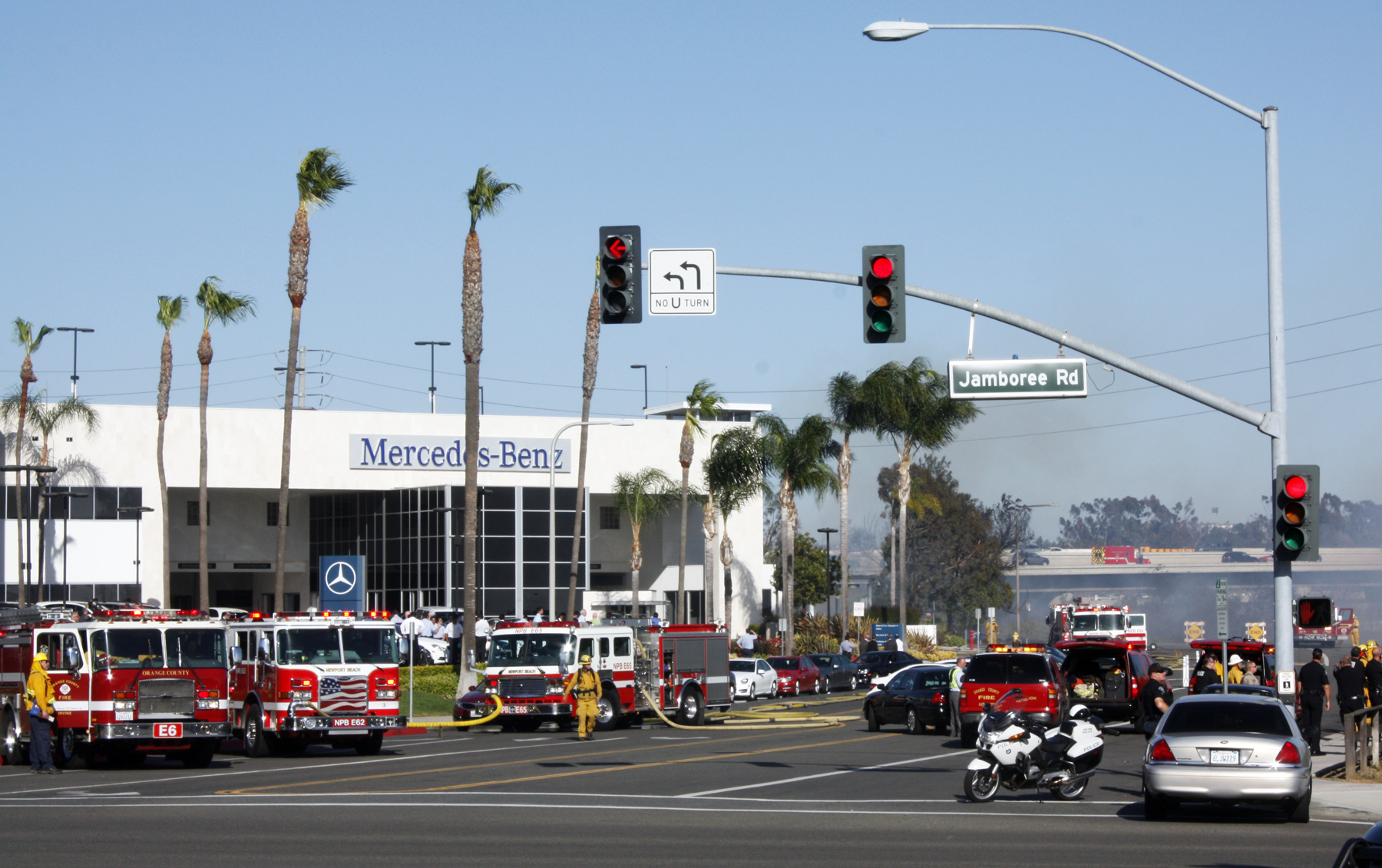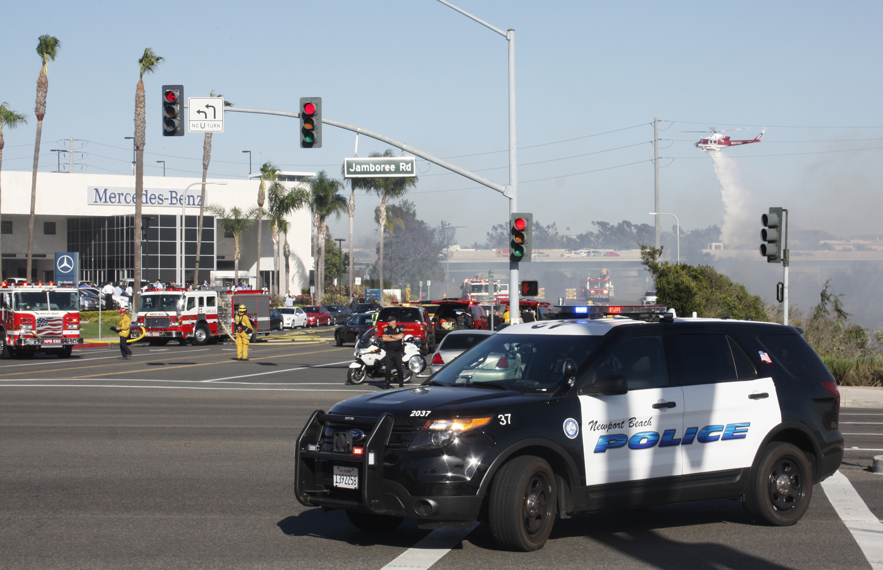 Twenty-five fire personnel responded to the scene, including six Newport Beach Fire Engines, two Strike Teams, the Orange County Fire Authority Helicopter, and additional personnel from the Costa Mesa Fire Department. Newport Beach Police were also on the scene to control traffic.
